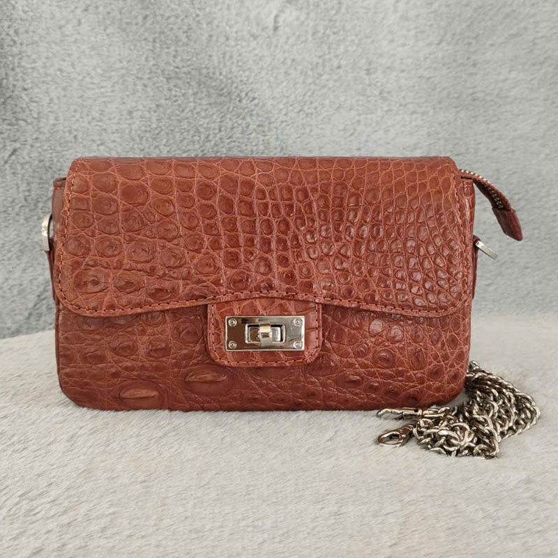 Chiếc túi xách da cá sấu nữ Hoa Cà 0258 – Da bụng nâu đỏ là sự kết hợp hoàn hảo giữa vẻ đẹp thanh lịch và đẳng cấp tự nhiên. Được chế tác từ phần da bụng cá sấu thật 100%, mẫu túi mang lại cảm giác mềm mại, vân da đều và sang trọng – biểu tượng của phong cách quý cô hiện đại.